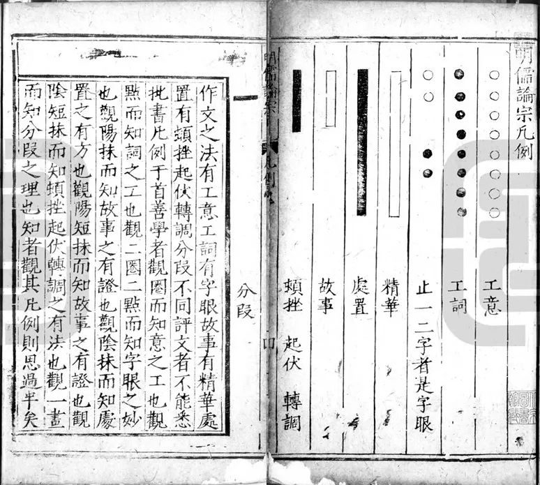 作文之法,有工意、工詞,有字眼、故事,有精華、處置,有頓挫、起伏、轉(zhuǎn)調(diào)、分段不同。評文者不能悉批,書凡例于首。善學者,觀圈而知意之工也,觀點而知詞之工也,觀二圈二點而知字眼之妙也,觀陽抹而知故事之有證也,觀陰抹而知處置之有方也,觀陽短抹而知故事之有證也,觀陰短抹而知頓挫、起伏、轉(zhuǎn)調(diào)之有法也,觀一畫而知分段之理也。知者觀其凡例,則思過半矣。29