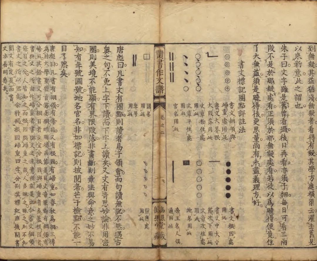 除了對聲音的關(guān)注,清人的閱讀理論對圈點運用也作了更深入的分析,出現(xiàn)了如清初唐彪《讀書作文譜》一類細致論述讀書法的專書。該書列有《書文標記圈點評注法》,指出“凡書文有圈點,則讀者易于領(lǐng)會,而句讀無訛”43,將圈點之法融入到閱讀理論之中,既便于讀者斷句識文,也有助于領(lǐng)會文章精華和寫作技法。分析晚明至清初文論家有關(guān)書籍閱讀的相關(guān)論述,有助于我們從文字以外的符號、聲音等視角去考察古代的讀書及作文法。