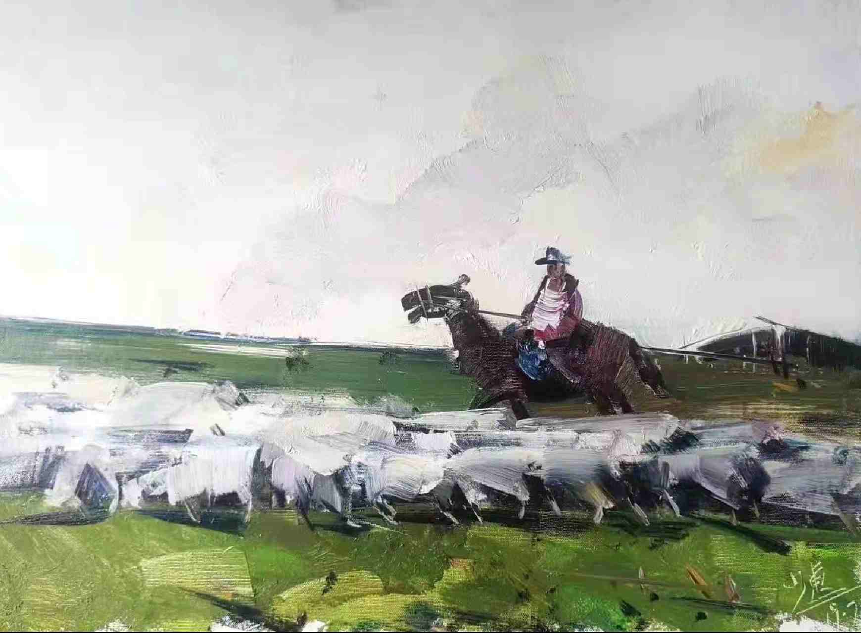 而胡少東的作品正是以他深愛的這片土地為素材,這里的沙漠、草原、駿馬、牛羊、帳篷、瓦房都成了他畫里的藝術(shù)素材,他是用現(xiàn)代的油畫藝術(shù)書寫著民族風(fēng)情的故事。少東的畫不是表現(xiàn)草原的壯美,就是大山的雄渾,不是草原兒女的健美就是西部農(nóng)家女孩的質(zhì)樸。草原帳篷有時(shí)在他畫里是主景,西部風(fēng)情的炊煙是他繪畫里的鄉(xiāng)愁。小河的溪水是歲月的長(zhǎng)歌,西部天空的深藍(lán)和濃云是他畫里是民族風(fēng)情故事的見證??瓷贃|的畫,一股民族風(fēng)情的勁風(fēng)迎面撲來,一部西部鄉(xiāng)土風(fēng)情的畫卷悅?cè)患埳稀?/p>