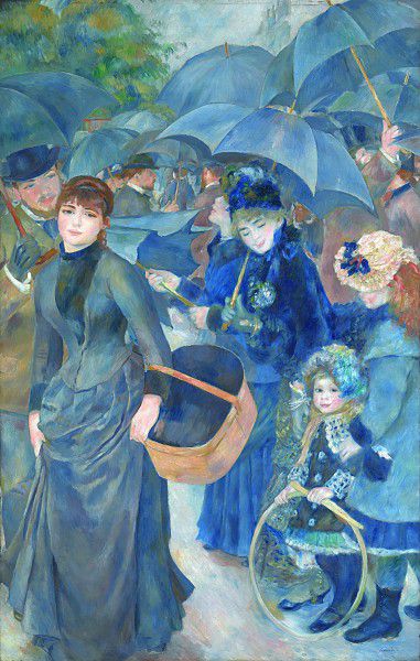 印象派畫家雷諾阿在其轉型時期繪制的作品《傘》是這種顏料的一個有趣范例。畫面右邊的一組四個人(包括一個小姑娘),是他所慣用的“經(jīng)典雷諾阿式”印象派畫法,用大量鈷藍色和黑色調在一起,早前他著名的《煎餅磨坊的舞會》中許多人物都使用了這種典型配色。然而在《傘》畫面左邊走向畫外的姑娘,是他晚了一兩年重新畫就的,這標志著他的風格轉型——他運用了他從好友塞尚那里吸取來的辦法,將群青、白色和赭石色,以一種更有節(jié)奏感、更沉著的筆觸編織起來,以確立人物紀念碑式的立體感。