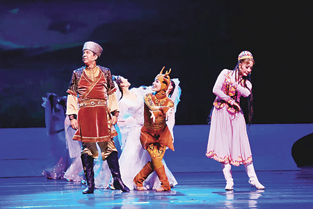 主創(chuàng)團隊融合了音、舞、詩、畫等藝術(shù)形式鍛造的美麗場面及戲劇化表演的敘事情景,恰到好處地使用了古代詩歌中常見的“比興”技巧,潤物無聲地表現(xiàn)新疆人民對愛情、幸福生活、真善美的追求?!氨取敝副扔?,其使用對人或物有更加形象的比喻,使其含義更加深刻,個性主旨鮮明突出?!芭d”指起興,借助其他事物作為情感發(fā)端,引起所要歌詠的內(nèi)容。該劇中第一篇章《美麗的傳說》中傳說的小鹿是“比”,象征美好純真的愛情。第二篇章順“勢”而為,有了“比”基礎(chǔ)的鋪墊之后,《心靈的呼喚》呼之欲出,呼喚的是忠貞純潔的愛情。人們對美好愛情的無比向往和追求。