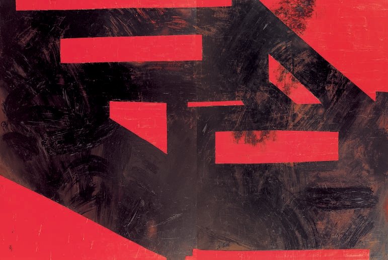 1999年至2003年之間,《直角》《椅子和椅子》《某年某月某日》《自己和自己的影子》《行》《四合》《紅》等一批作品接連問世。人們在這批作品中已經(jīng)看不到王懷慶曾經(jīng)過硬的速寫功底、塑造人物的肖像能力以及唯美而簡淡的詩境,只留下更加冷峻理性的圖式與筆觸。這些“物形”被解構(gòu)的畫面讓觀眾直接越過客體,進入交錯線條節(jié)奏與結(jié)構(gòu)的審美,引發(fā)對人與天、人與地、人與人、人與己四合關(guān)系的深層思考。王懷慶試圖給這個紛亂世界以秩序的力量。