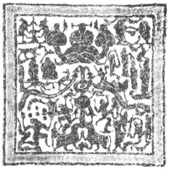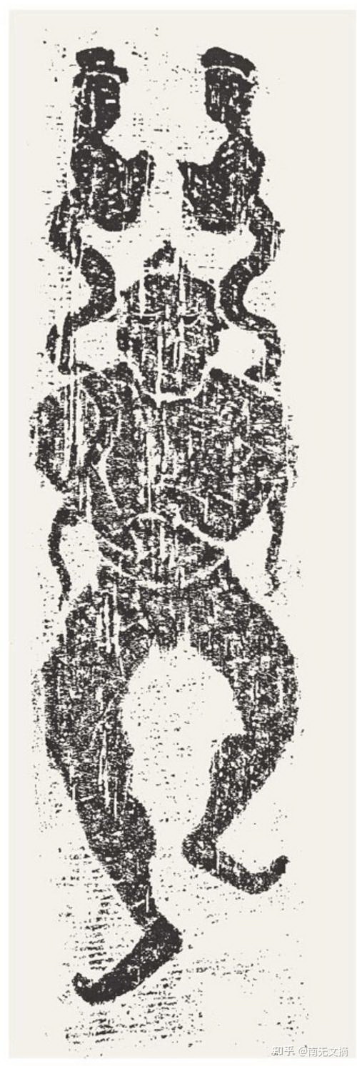 西漢中期,祠“高禖”祈子的風(fēng)俗已上升為禮制。如司馬彪《后漢書志·禮儀上》記:“仲春之月,立高禖祠于城南,祀于特牲?!弊⒃唬骸皾h武帝晚得太子,始為立高禖之祠。高禖者,人之先也。故立石為主,祀以太牢?!睆拇罅看媸赖臐h畫像磚石上,可找尋到祭祀高禖的場(chǎng)景。如徐州銅山漢畫像磚拓片,該漢畫雕刻怪神高禖。兩邊有伏羲女媧兩尾相交纏繞,左邊二玉兔搗藥,右邊二神似抬物送饌,下邊刻繪二神獸相向用嘴高舉建鼓,二人邊鼓邊舞。左邊一人在弄丸,右邊二人在格斗。羽葆上神獸嬉戲追逐跳躍。兩邊各有衣冠整潔的官人在觀賞雜技表演和視聽仆人侍候進(jìn)諫。