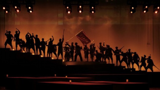 《鐵流東進》在話劇形式上的探索是多方面的。該劇打破常規(guī),不分幕場,即區(qū)別于通常每幕之間有休息、轉(zhuǎn)場與適當停頓,而是全劇一氣呵成,中間只有短暫的暗場作為過渡。應該說,這一創(chuàng)新對演員的演技、體能、臺詞功夫以及舞臺調(diào)度等各方面都構(gòu)成極大挑戰(zhàn)。劇中,顧團長、杜南海、彭大刀、李安本、賀電(李安本孫子)的演說與獨白都有著撼人心魄的力量,演出中觀眾們多次熱烈鼓掌,也是這部劇表演水平的充分證明。突破幕場的設置能夠使劇情與節(jié)奏更加緊湊,戲劇張力更為飽滿,觀眾在兩個多小時的觀演中,心弦始終被演員和舞臺緊緊抓住。