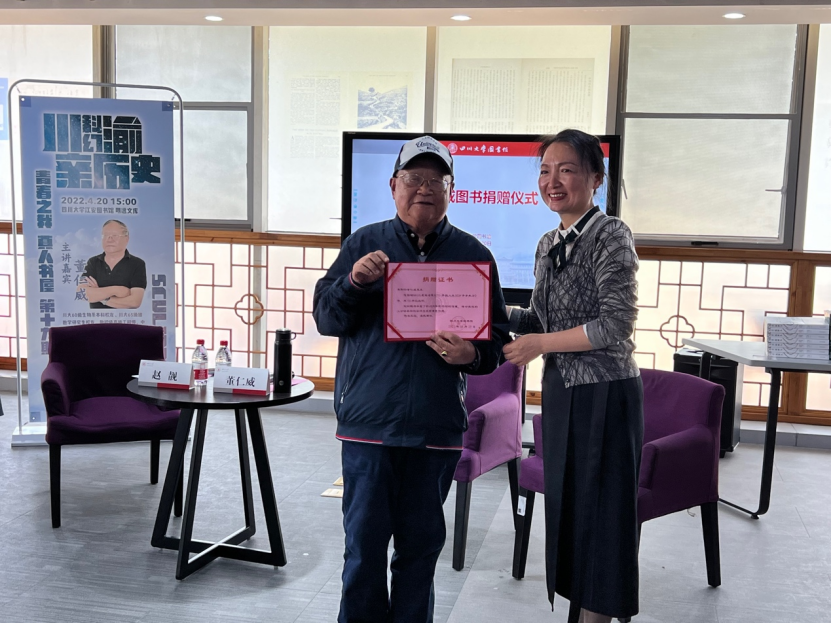 隨后,董仁威老師向四川大學捐贈藏書,四川大學圖書館館長蘭利瓊接受了捐贈,并向捐贈人董仁威老師頒發(fā)捐贈證書。蘭利瓊館長用“三個真”表達了她的感受,第一個“真”是真實地感受到何為著作等身,董老的產(chǎn)出涉獵甚廣,真的是又多又精;第二個“真”是真切地感覺到何為成功人士,董老用他的人生經(jīng)歷完美地詮釋了成功的真諦,天賦、才華加上超出常人的努力和高遠的胸懷和格局才能讓人走向成功;第三個“真”是真摯的感謝和真誠的敬意,董老在谷雨時節(jié)這天為圖書館帶來的藏書及他求學創(chuàng)作的心路歷程,就如谷雨生萬物一般,為川大師生帶來了心靈上的甘露和寶貴的精神財富。