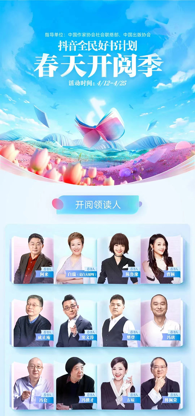 與抖音發(fā)起“抖音全民好書計劃·春天開閱季”系列活動,聯(lián)合多家媒體機構(gòu)、出版機構(gòu),通過系列直播、短視頻等形式,鼓勵群眾分享新書好書,倡導全民閱讀,自4月12日活動啟動以來,目前全網(wǎng)觀看量達2.6億。