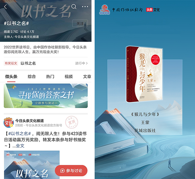 與今日頭條文化頻道發(fā)起的“以書之名”世界讀書日特別活動,開展讀書征文、發(fā)表閱讀心得,目前話題全網(wǎng)閱讀量已突破3億,4.6萬人參與討論。