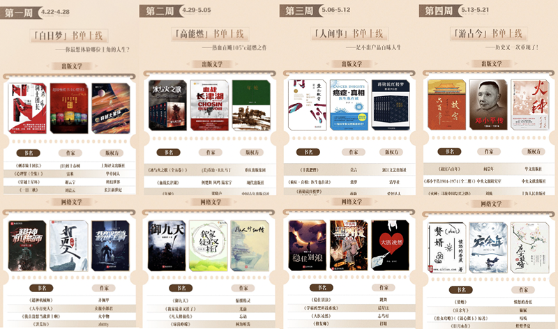 為迎接即將到來(lái)的第27個(gè)世界讀書(shū)日,閱文集團(tuán)聯(lián)合國(guó)家圖書(shū)館、上海圖書(shū)館以及人民文學(xué)出版社、人民郵電出版社、北京大學(xué)出版社、中國(guó)青年出版總社等100家出版單位共推全民閱讀。4月22日至5月21日,閱文集團(tuán)旗下起點(diǎn)讀書(shū)APP開(kāi)啟“全民閱讀月”,首次限免200本付費(fèi)好書(shū),覆蓋文學(xué)、小說(shuō)、傳記、經(jīng)濟(jì)等20余大品類(lèi)。國(guó)家圖書(shū)館文津圖書(shū)獎(jiǎng)部分好書(shū)也將同步限時(shí)免費(fèi)開(kāi)放。