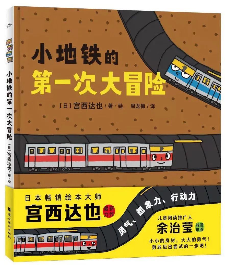 許多孩子的記憶里,宮西達(dá)也是溫暖和憂傷的代表。每一只經(jīng)歷過(guò)創(chuàng)傷、又被溫柔以待的小恐龍,都是宮西達(dá)也對(duì)世界的善意。這些善意,也在他多個(gè)系列的故事中始終如一地傳遞。新作《小地鐵的第一次大冒險(xiǎn)》中,宮西達(dá)也將第一次擔(dān)任行駛?cè)蝿?wù)的地鐵列車比作一個(gè)進(jìn)入新環(huán)境的孩子。繪本中,外面的世界在小地鐵的想象里充滿離奇古怪的因素:飛機(jī)就像鐵鳥(niǎo)滿載乘客、人類都住在盒子一樣的樓房里,太可怕了,會(huì)不會(huì)有大蛇把隧道咬斷?從膽怯、畏懼,到鼓足勇氣開(kāi)始探索,再到最終釋懷,開(kāi)始向更大的世界探索,在簡(jiǎn)單童稚的畫風(fēng)中,小地鐵的心情讓孩子感同身受。作者將他們對(duì)未來(lái)的期待、好奇和擔(dān)憂詮釋出來(lái),給予安撫、寬慰和鼓勵(lì),家有適齡孩子的才會(huì)理解這種懵懂的緊張和期待,并會(huì)心一笑。