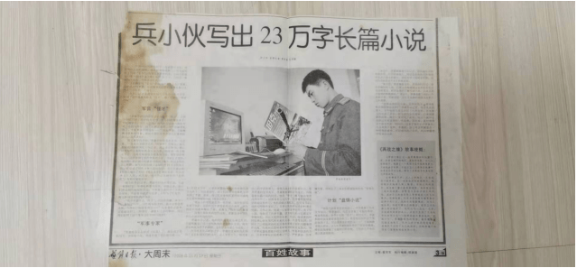 銀月光華:第一本小說初稿完成之后,一直想拿出去試試自己什么水平。當(dāng)時我用電腦單機(jī)操作,用3.5寸軟盤刻錄好內(nèi)容,郵寄給朋友發(fā)表,當(dāng)時就被鐵血的編輯看中,正式簽約,這是意外之喜。那時候沒有因為這本小說賺到錢,但卻是一種重要的肯定。小說完結(jié)后受到了當(dāng)?shù)厝請蟮年P(guān)注,某一個下午記者來部隊采訪,當(dāng)時部隊干部也很高興,認(rèn)為我是給部隊爭光了,報道發(fā)表后我沒想到篇幅居然很大,大概有半開報紙的四分之一版面,照片還很清晰。我最親愛的姥姥還把報道壓在茶幾下,逢人來便能看到,姥姥去世后,我把那份報道留到現(xiàn)在。