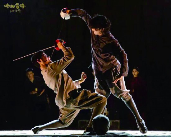 全戲最能凸顯藏族氣質(zhì)的場(chǎng)景當(dāng)屬雷歐提斯與哈姆雷特最后的決斗。二人劍拔弩張,藏族青年演員的民族血?dú)庠诖丝贪l(fā)揮得淋漓盡致。從激烈打斗到最后一一倒下,每個(gè)動(dòng)作、每場(chǎng)交鋒都極具力量感與爆發(fā)力,緊緊牽動(dòng)著觀眾的心。最后二人紛紛倒下,在死亡即將來(lái)臨的時(shí)刻,他們抬起頭,向上天言說(shuō)著,他們仿佛看到了頭頂盤(pán)旋的禿鷲,兩位英勇青年的死亡有種莫名的蒼涼感。除了決斗橋段外,哈姆雷特的獨(dú)白也被藏族演員扎西邊巴羅布(普通話版)和頓珠次仁(藏語(yǔ)版)演繹得十分出彩。藏族演員在表演“生存還是毀滅”的大段獨(dú)白之時(shí),每一個(gè)肢體動(dòng)作都傳遞著哈姆雷特的掙扎與無(wú)力。身體與言語(yǔ)的共振式闡釋讓原本枯燥的大段獨(dú)白深入人心,觀眾們仿佛能與哈姆雷特此刻的猶豫與痛苦共情。盡管兩位藏族演員的普通話還不夠標(biāo)準(zhǔn),臺(tái)詞說(shuō)起來(lái)過(guò)快,但他們?cè)谖枧_(tái)上奪人眼球的肢體表達(dá)足以彌補(bǔ)這一瑕疵。