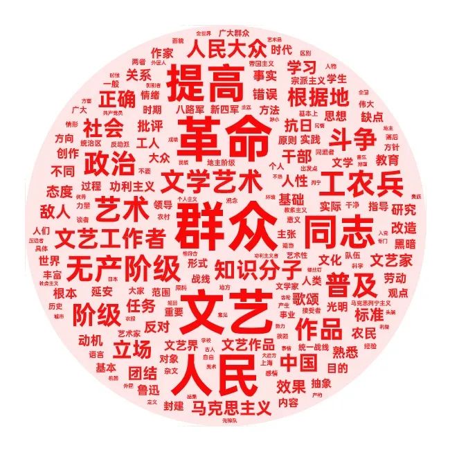 上圖是以中國(guó)文明網(wǎng)發(fā)布的毛澤東同志《在延安文藝座談會(huì)上的講話》為文本內(nèi)容,通過(guò)詞頻分析生成的文字云圖。