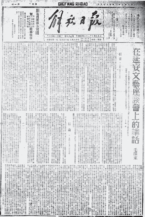 1943年10月19日,延安《解放日報》全文發(fā)表毛澤東《在延安文藝座談會上的講話》
