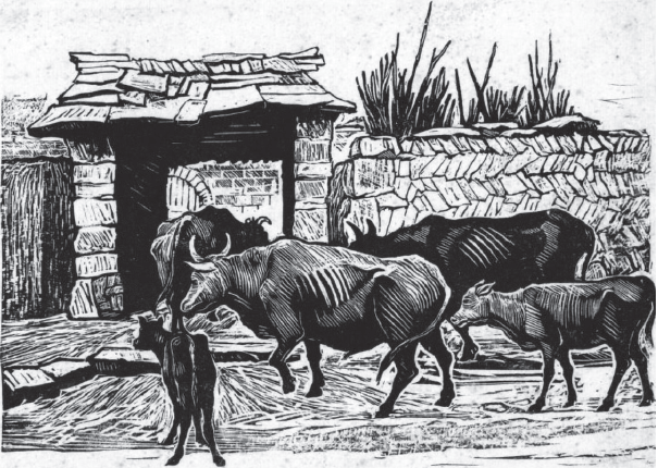 《羊群》之后,古元又創(chuàng)作了木刻版畫《牛群》。整個畫面上,只有五頭牛,大大小小,形態(tài)各異,背景是一處陜北農(nóng)家院墻,靜穆祥和,樸實硬朗,沒有精致的裝飾,也沒有夸張的變形,是一派生機勃勃的現(xiàn)實生活場景。曾經(jīng)和古元同時在碾莊掛職的葛洛回憶說:“那幾頭牛是多么可愛啊,大的膘壯體圓,堅強有力,小的憨態(tài)可掬,富有生機。無怪乎這幅作品剛完成,就受到老鄉(xiāng)們的熱愛,爭著向古元討取一張。兒童們則指著畫中的牛展開爭議,有的說那頭大犍牛畫的是我家的,有的又說是他家的?!备τ谵r(nóng)民來說,不僅是最大的牲畜,而且是家里最大的勞動力。“古元在這幅木刻中所表達的與其說是牛的形體美,不如說是農(nóng)民對生活的信心和希望?!?/p>