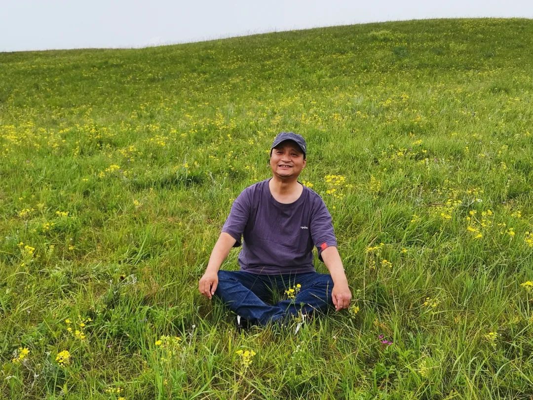 一群牛在吉日河畔散開,岸邊的水草高過人的頭頂。?!椎滓r黃色花斑,或黃底襯白色花斑,也有一身純黃、一身素白的——在贊嘆造物的精妙的同時,我在想,牛可以自主選擇皮毛的花色嗎?像人類出門前挑選衣服?眼前一切都是好景致,像草原的拼盤。我們紛紛選擇背景和姿勢,留下永恒的瞬間。視角、凸透鏡、影像傳感器、曝光,相片把人和景物固定在一個時光的鏡框內(nèi)。人生不易,相片是最好的紀念。同行的女子們換完衣服后,又照了一次。她們?yōu)榇诵袦蕚淞撕枚囡椢?,傘、遮陽帽、太陽鏡、圍巾……蒙古族女孩麗花送的一條藍色哈達輾轉(zhuǎn)其手??扉T聲此起彼伏,她們用科學的手段,把生活的細節(jié)收集在一起。