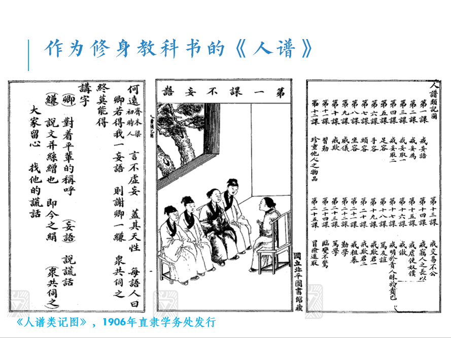限于初等教育的修身科,有將“修身”概念矮化之嫌。壬寅學(xué)制中,從蒙學(xué)堂、小學(xué)堂到中學(xué)堂,修身科的教本與教法是有差別的。蒙學(xué)堂旨在培養(yǎng)兒童使有淺近之知識(shí),修身課的目的在教授孝悌忠信、禮義廉恥、敬長(zhǎng)尊師、忠君愛(ài)國(guó),“比附古人言行,繪圖貼說(shuō)”[7]。壬寅學(xué)制的小學(xué)堂章程基本搬用日本小學(xué)的課程分類。尋常小學(xué)堂的修身課,教授《曲禮》、朱子《小學(xué)》諸書(shū)中平近切實(shí)的內(nèi)容,高等小學(xué)堂則“授以性理通論、倫常大義”[8]?!稓J定中學(xué)堂章程》中的修身課與讀經(jīng)關(guān)系密切,“當(dāng)本《論語(yǔ)》《孝經(jīng)》之旨趣,授以人倫道德之要領(lǐng)”[9]??傮w而言,1902年壬寅學(xué)制對(duì)“修身”科的設(shè)置,在如何修身、為何修身兩大問(wèn)題上,給出的教學(xué)導(dǎo)向是較為粗略浮泛的。