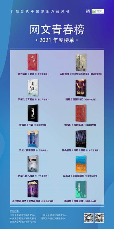 2022年5月,五校正式聯(lián)合,推出“網(wǎng)文青春榜” 2021年度榜單,并將共同主辦接下來的榜單遴選活動(dòng),每個(gè)高校輪流負(fù)責(zé)一期,每期推選6-10部作品。