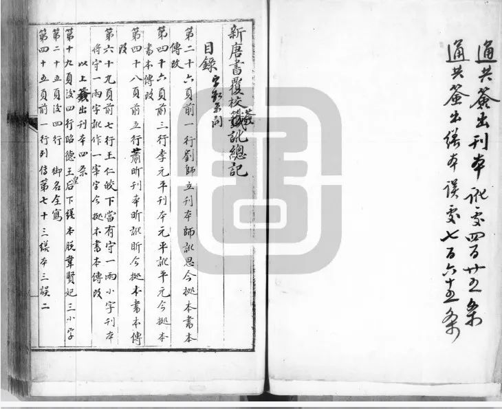 頗為吊詭的是,《校檔》中書名題署為“新唐書復(fù)校簽訛總記”的一頁上還題有“(乾?。┧氖辏┲廖逶鲁醢巳珍N訖,送總裁,發(fā)下銷訖,又查存疑簽,辦過一半”(見圖4),據(jù)此可知,《校檔》于乾隆四十六年五月仍在四庫館銷簽,因而纂定時(shí)間必當(dāng)延續(xù)至此。又查《四庫全書薈要》史部正史類收錄《新唐書》,其提要的校上時(shí)間為乾隆四十二年正月[10],是知《新唐書》于乾隆四十二年正月前已經(jīng)辦理完竣并繕入《四庫全書薈要》,這便與《校檔》登載的《新唐書》于乾隆四十六年五月初八日的銷簽記錄相違伐。《新唐書》雖經(jīng)過分校官校閱,于乾隆四十二年抄入《薈要》,但由于《四庫全書》仍在編纂,《新唐書》又經(jīng)四庫館臣校訂,直至謄抄定本,故而《校檔》中保留了兩次《新唐書》校改記錄?!缎n》中第一次《新唐書》簽改注明“薈要”,應(yīng)屬于“薈要處”校閱《新唐書》時(shí)的復(fù)校記錄,而第二次簽改作《新唐書復(fù)校簽訛總記》,應(yīng)該是“全書處”進(jìn)行的復(fù)校,第二次簽訛時(shí)書名中增加“復(fù)校簽訛總記”六字,題名差異恰能反映兩次簽訛的區(qū)別。再從兩次簽改的具體內(nèi)容來看:第一次作“繕本《考證》一頁三行應(yīng)加〇,馀無誤。刊本無簽”,第二次作“刊本無訛。三頁后二行‘扂’誤‘居’,八頁六行‘臣’誤‘誠’,以上簽出繕本二條”。對(duì)比前后兩次的內(nèi)容,《新唐書》的謄錄者已經(jīng)部分采納了第一次簽改的意見;館臣第二次校簽時(shí),刪去了加〇的內(nèi)容,并補(bǔ)充多條有關(guān)繕本《新唐書》的訛誤。再如第一次簽改中卷二百二十二下與卷二百二十三上皆著錄“苻堅(jiān)誤作符堅(jiān)”;第二次簽改卷二百二十三上時(shí),四庫館臣用墨筆勾乙刪去此條。由此可知《新唐書》第二次內(nèi)容較第一次有所刪改。據(jù)此,《校檔》中登載乾隆四十六年五月《新唐書》仍在四庫館銷簽,應(yīng)屬于全書處復(fù)校流程,與薈要處無涉。