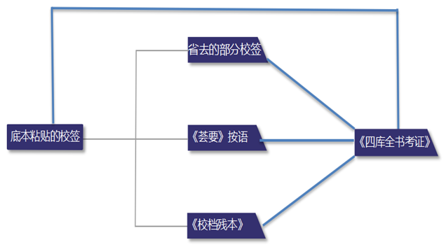 值得注意的是,校檔還與《四庫全書考證》的編纂密切相關(guān)。相關(guān)研究表明,《考證》乃是館臣擇取黃簽匯編而成,而黃簽其實(shí)就是校簽的一種,只不過由于需要進(jìn)呈御覽,所以區(qū)別于一般校簽[24]?!缎n》中《新唐書》和《釋音》后有“凡黃簽須明白曉暢,進(jìn)呈時(shí)一覽了然,若重沓支離,均不足取,倘太簡略,又不可以此籍口急索解,人不可得尚其旦暮遇之”,據(jù)此可知,《校檔》是黃簽加工過程中的載體之一,很可能是《四庫全書考證》成書過程中的重要一環(huán)。循此路徑,將《考證》與《校檔》的校簽一一核對(duì),發(fā)現(xiàn)二者并不能完全對(duì)應(yīng)。除《考證》所錄《新唐書》與《釋音》的簽改意見均能在《校檔》中找到出處外,其他各書的簽訛內(nèi)容,皆互有異同。由于《校檔》中《新唐書》與《釋音》抄寫工整,且抄紙有界欄,與各書不同,猜測這兩書應(yīng)是復(fù)校核對(duì)簽訛記錄后,重新謄抄的較為整飭的內(nèi)容,因此在編纂《考證》時(shí)可直接從中選擇黃簽。而且,《四庫全書薈要》中的按語,也與《校檔》或《四庫全書考證》多有不同。筆者認(rèn)為這三種簽改內(nèi)容,皆由粘貼在底本上的校簽轉(zhuǎn)化而來,在《薈要》與《四庫全書》的編纂過程中,有些底本上的校簽作為按語抄入《薈要》,部分內(nèi)容則移錄至校檔。館臣自底本校簽、《薈要》按語、校檔中選擇校簽加工成黃簽,再將黃簽匯編成《四庫全書考證》,具體的流程或如下圖: