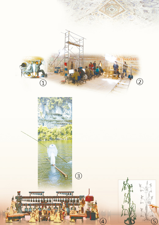 圖①圖②:敦煌研究院團(tuán)隊(duì)在進(jìn)行壁畫修復(fù)和洞窟數(shù)字化信息采集。 敦煌研究院供圖 圖③:楊柳獨(dú)竹漂表演。 楊 柳供圖 圖④:湖北省博物館編鐘樂團(tuán)演出現(xiàn)場。 馬業(yè)平供圖 圖⑤:三星堆出土的青銅神樹及考古繪圖。 三星堆博物館供圖