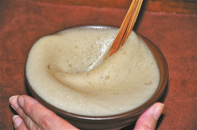 第三步:繼續(xù)續(xù)水,繼續(xù)攪拌,泡沫越來越厚,茶湯越來越白