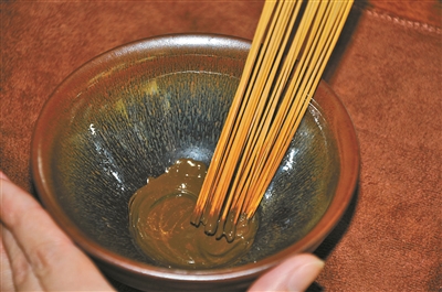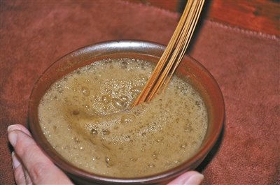 第二步:續(xù)入熱水,用茶筅攪拌敲擊
