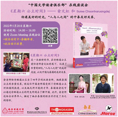 2022年6月11日,泰國“中國文學(xué)讀者俱樂部”成功舉辦《星期六公主時間》在線座談會。這是泰國俱樂部成立以來舉辦的第二場活動。曾擔(dān)任泰國公主詩琳通中文老師的中國作家俞文虹、《星期六公主時間》泰語譯者蘇麗(Suree Choonharuangdej)、南美有限公司總經(jīng)理陳美琪以及中國文學(xué)愛好者等共計(jì)40多人參加了此次活動。