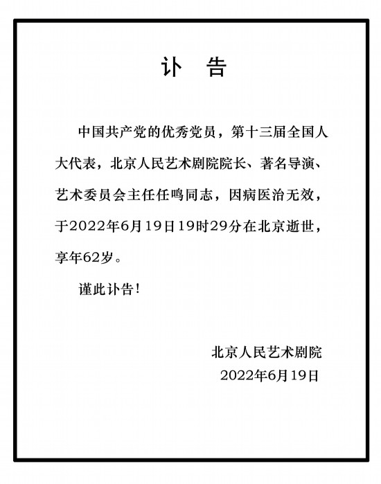 北京人民藝術劇院發(fā)布訃告:中國共產(chǎn)黨的優(yōu)秀黨員,第十三屆全國人大代表,北京人民藝術劇院院長、著名導演、藝術委員會主任任鳴同志,因病醫(yī)治無效,于2022年6月19日19時29分在北京逝世,享年62歲。