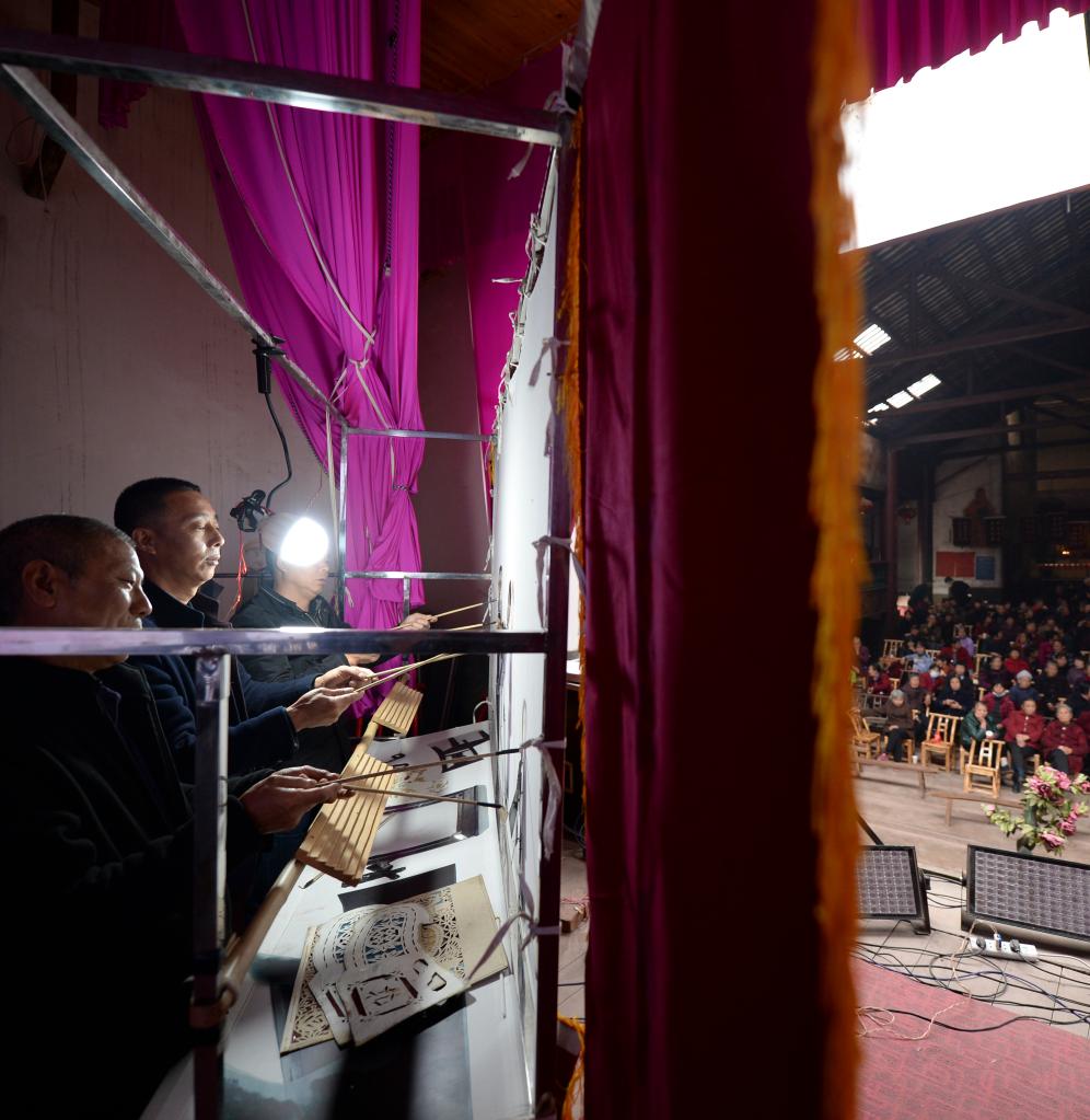 在湖南省瀏陽市沙市鎮(zhèn)秧田村,宋偉軍(左二)和劇團(tuán)成員表演皮影戲(2021年11月16日攝)。新華社記者 陳振海 攝