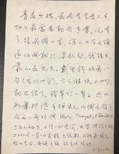 信中有他對我為人為學(xué)的指點,有對生活的指導(dǎo),更多的則是對美的事物的分享。比如1995年夏秋之際的來函,先生寫道:“我的全部本領(lǐng),是熟讀一家,熟讀傅譯?,F(xiàn)在依然是學(xué)徒,與你,不過先學(xué)后學(xué)之分,而且后來必定能居上的!”“做學(xué)問,首先是學(xué),誰看的書多,誰的學(xué)問大?!薄拔抑挥袃纱纬晒Φ拈喿x:花四年時間只看傅譯;四個月在社科院圖書館為寫《翻譯論集》的萬字長文……寫論文,還是要先查資料多看書,勿學(xué)得模模糊糊,看書做學(xué)問不能功利?!贬槍ξ耶?dāng)時所提出的“德國浪漫派本身或許就是一部大的翻譯史,我再想進(jìn)一步回望我們五四前后的文學(xué)史”,羅先生指出:“ (我們可以說)五四后的創(chuàng)造性翻譯——中國新文學(xué)”,“五四后的新文學(xué)本身就是一部翻譯作品!也不妨石破天驚一下。此戲言爾,但此戲言如有幾分可靠,不妨大膽假設(shè),小心求證,做一篇大文章出來”,“你文化視界一文,只是忠實地研讀貝爾曼,(做)新文化思考,才是創(chuàng)造性的研讀?!?/p>
