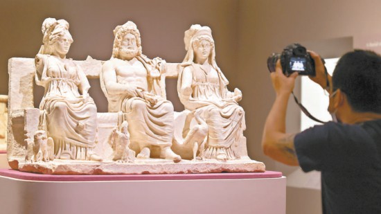 每件展品都值得仔細(xì)觀賞。第一件展品是“祭拜瑪爾斯、維納斯和森林之神西爾瓦諾斯的圣壇”,四面雕刻著精美的圖樣。站定細(xì)看,上面講述了羅馬的起源——母狼哺育雙胞胎的神話故事。潘晴繞著四周,講解細(xì)節(jié):“戰(zhàn)神瑪爾斯、美神維納斯,旁邊的是奧斯提亞牧羊人的守護(hù)神,這些畫面表達(dá)了羅馬民族具有神祇血脈的主題?!?/p>