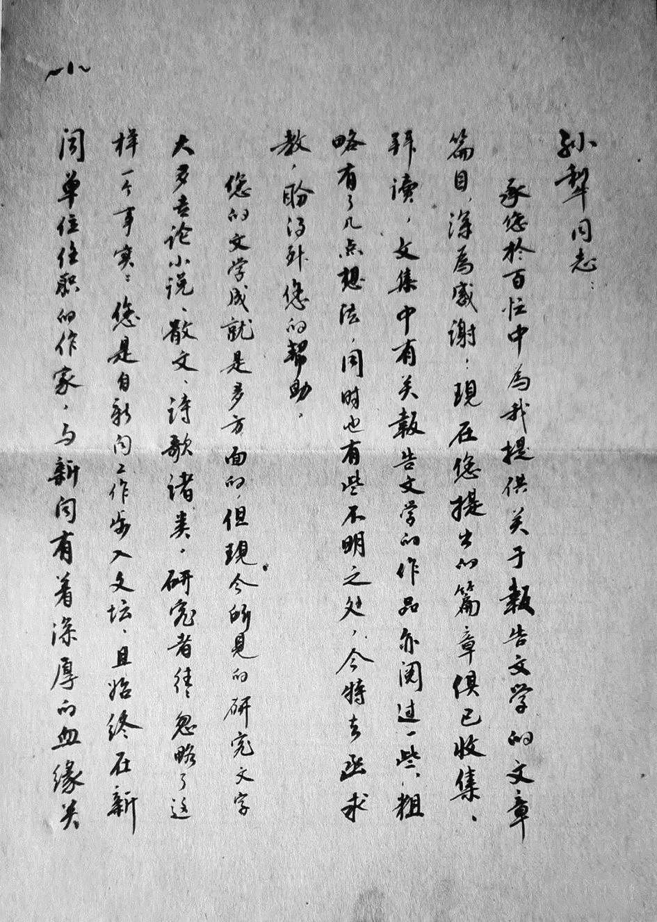 你的來信,不知能否在《報(bào)告文學(xué)》上發(fā)表一下,也是對這一文體的一種助興。請你考慮。原信附上備用。