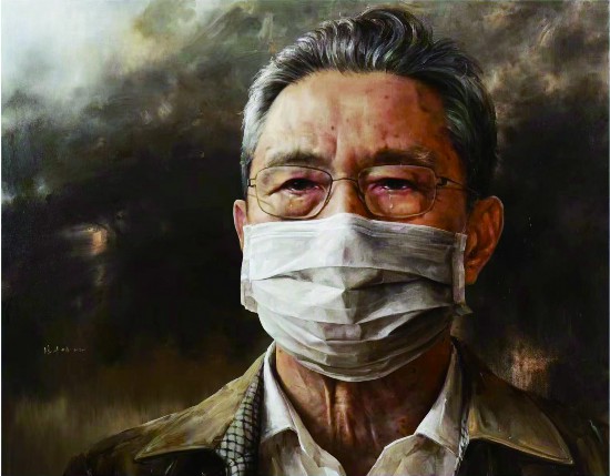 該作品以鐘南山院士正面頭像為主要表現(xiàn)對(duì)象,突出其醫(yī)生、黨員、院士、老人等身份,畫面中灰白頭發(fā)、皺紋、斑點(diǎn)、眼淚、口罩、眼鏡等細(xì)節(jié),以及仁心、憐憫、憔悴、堅(jiān)毅、奉獻(xiàn)等精神符號(hào),都具有特殊時(shí)期的典型性、象征性。畫幅巨大,給人以強(qiáng)烈視覺沖擊和震撼。畫家盡情發(fā)揮油畫寫實(shí)表現(xiàn)力強(qiáng)的特性,對(duì)人物面部主要特征進(jìn)行深入和細(xì)致刻畫,使之鮮明逼真、生動(dòng)傳神、立體飽滿,寫實(shí)而不刻板。肖像背景采用寫意性的鋪染,與面部主體寫實(shí)具象手法形成對(duì)比,人像更突出,陰沉灰暗的風(fēng)云涌動(dòng)襯托出形勢(shì)氣氛的艱難嚴(yán)峻。在色彩處理上,以灰、黑、白、褐、赭、土黃等為主色系,藝術(shù)上更豐富、渾厚、深沉。畫家都在有意或自覺地向經(jīng)典性作品的高要求不斷努力,并達(dá)到了滿意的效果。