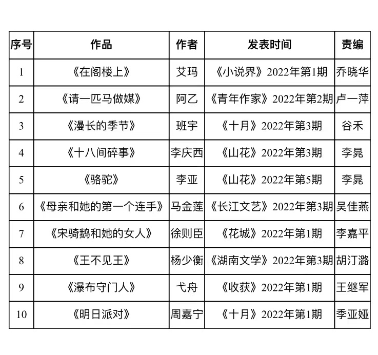 綜合2022年1月至6月每期推薦的所有作品,經(jīng)評(píng)審團(tuán)再次推選、評(píng)議并投票,中國(guó)作家網(wǎng)“優(yōu)選中短篇”半年榜出爐,以下為最終入選的十部作品(排名以作者姓氏拼音為序)。