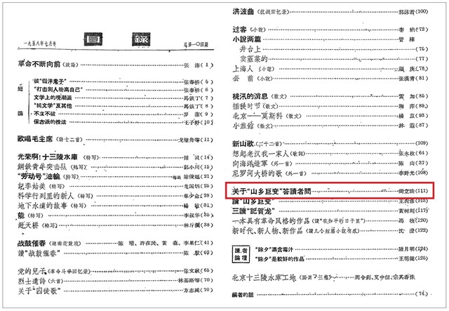 《人民文學》1958年7月號封面、目錄