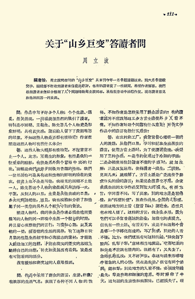 著名作家周立波代表作長篇小說《山鄉(xiāng)巨變》在《人民文學》1958年1至6月號連載推出,引發(fā)了廣泛的關注和熱烈的討論。六個月內(nèi),編輯部不斷收到讀者來信,給出好評,也有部分讀者提出了一些相關的疑問,希望作者解答。《人民文學》編輯部根據(jù)讀者來信,綜合整理了幾個問題轉(zhuǎn)給周立波,并在當年7月號刊出《關于“山鄉(xiāng)巨變”答讀者問》一文,將讀者意見與作家的回答一并發(fā)表。
