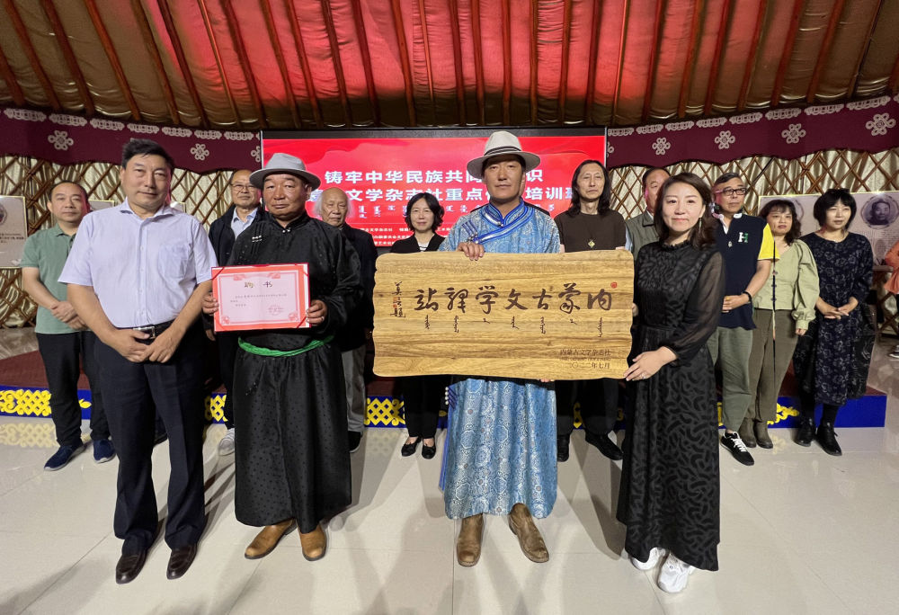 7月26日,在錫林郭勒盟正鑲白旗舉行的“鑄牢中華民族共同體意識·內(nèi)蒙古文學雜志社重點作家培訓班開班儀式”上,正鑲白旗伊克淖爾蘇木阿日善嘎查黨支部書記、嘎查長蘇德,從內(nèi)蒙古文學雜志社社長賈翠霞手中接過“內(nèi)蒙古文學驛站”牌匾,標志著內(nèi)蒙古文學雜志社首個文學驛站誕生。隨后的7月29日,第二個“內(nèi)蒙古文學驛站”在錫林郭勒盟正藍旗設立。