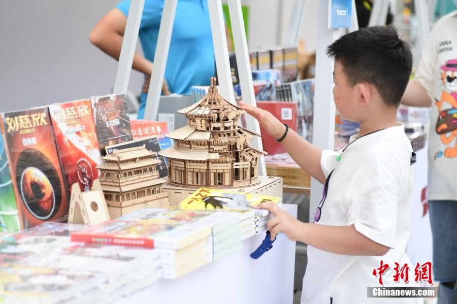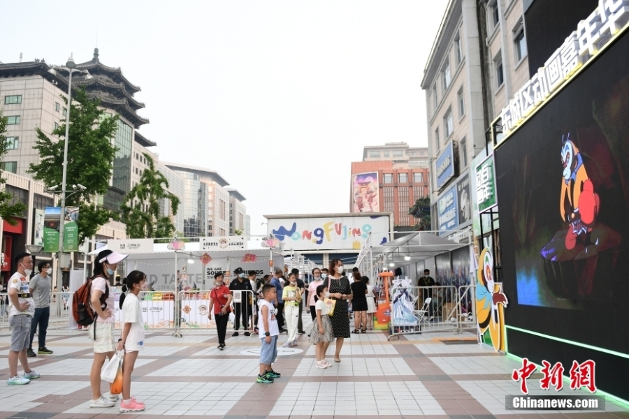 8月4日,市民在北京王府井步行街觀看戶外大屏上播放的動畫片,在北京王府井步行街體驗動漫繪本,小朋友在北京王府井步行街觀賞祈年殿拼插模型。