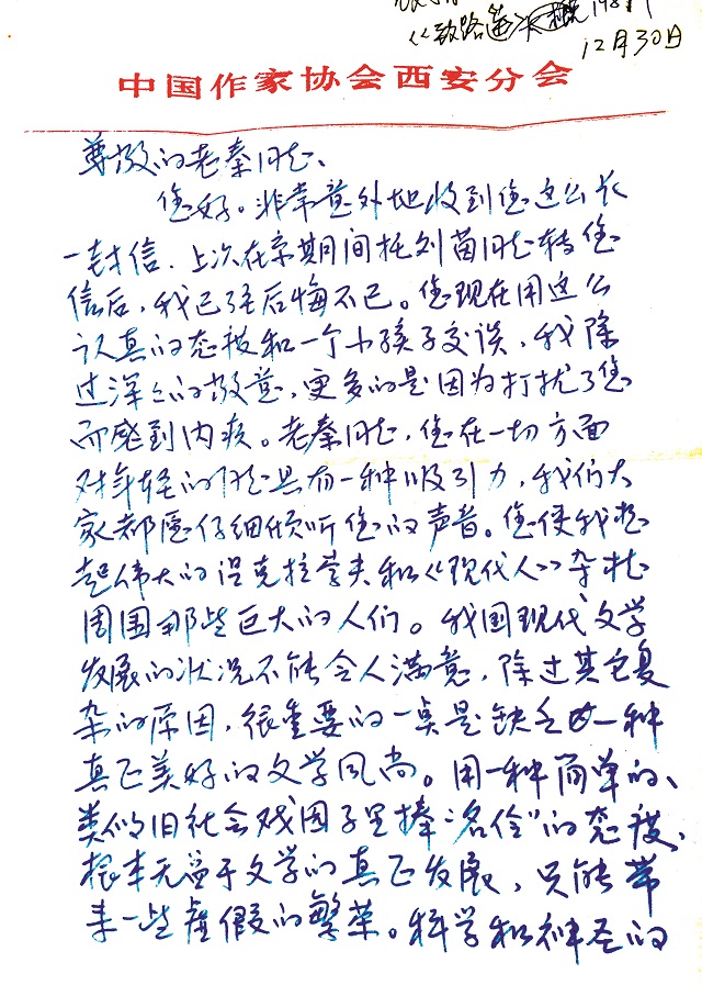 您好。非常意外地收到您這么長(zhǎng)一封信。上次在京期間托劉茵同志轉(zhuǎn)您信后,我已經(jīng)后悔不已。您現(xiàn)在用這么認(rèn)真的態(tài)度和一個(gè)小孩子交談,我除過(guò)深深的敬意,更多的是因?yàn)榇驍_了您而感到內(nèi)疚。老秦同志,您在一切方面對(duì)年輕的同志具有一種吸引力,我們大家都愿仔細(xì)傾聽您的聲音。您使我想起偉大的涅克拉索夫和《現(xiàn)代人》雜志周圍那些巨大的人們。我國(guó)現(xiàn)代文學(xué)發(fā)展的狀況不能令人滿意,除過(guò)其它復(fù)雜的原因,很重要的一點(diǎn)是缺乏一種真正美好的文學(xué)風(fēng)尚。用一種簡(jiǎn)單的、類似舊社會(huì)戲園子里捧“名伶”的態(tài)度,根本無(wú)益于文學(xué)的真正發(fā)展,只能帶來(lái)一些虛假的繁榮??茖W(xué)和神圣的東西讓一些嘻皮笑臉的人操持怎么能讓人不寒心呢?在這樣一種情況中,一個(gè)嚴(yán)肅的、熱情的、不看門第而竭盡全力真正關(guān)懷文學(xué)事業(yè)發(fā)展的人,他所發(fā)出的聲音——站在山巔上發(fā)出的獨(dú)特的、深沉的哲人和詩(shī)人的聲音,對(duì)文學(xué)公眾的吸引力是無(wú)可比擬的,因?yàn)檫@一切在我們的環(huán)境中是寶貴的。
