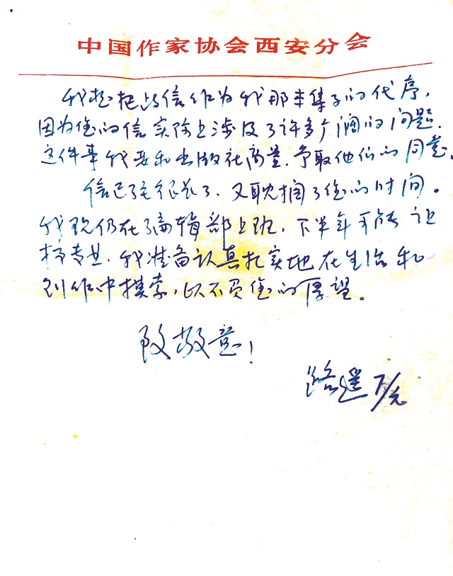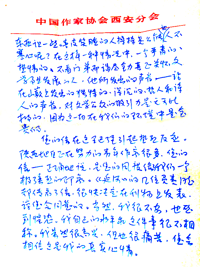 您的信在這里已經(jīng)引起熱烈反應(yīng),陜西地區(qū)正在努力的青年作家很多,您的信——正確地說(shuō),是您的風(fēng)度給了我們一個(gè)極強(qiáng)烈的印象。《延河》的幾位負(fù)責(zé)同志都傳看了信,很快決定在刊物上發(fā)表,諒您會(huì)同意的。當(dāng)然,我很不安,也感到惶恐。我自己的水平和這件事很不相稱。我雖然很高興、但也很痛苦,您會(huì)相信這是我的真實(shí)心情。