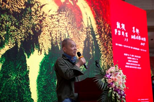 開(kāi)幕式上,漫畫(huà)家蔡志忠發(fā)來(lái)視頻賀辭。作家梁曉聲,國(guó)家發(fā)改委書(shū)畫(huà)協(xié)會(huì)會(huì)長(zhǎng)王思強(qiáng),中國(guó)世界民族文化交流促進(jìn)會(huì)副會(huì)長(zhǎng)兼秘書(shū)長(zhǎng)邱麗,中央美術(shù)學(xué)院教授、喀什大學(xué)美術(shù)與設(shè)計(jì)學(xué)院院長(zhǎng)薛云祥,中國(guó)畫(huà)大師黃胄之女梁纓,廣西大家育才教育投資有限公司董事長(zhǎng)傅連城,畫(huà)家賀鵬飛先后發(fā)表致辭。王思強(qiáng)還代表中國(guó)美協(xié)駐會(huì)副主席、黨組書(shū)記馬鋒輝對(duì)本次畫(huà)展表示祝賀。文化和旅游部原黨組成員、中國(guó)非物質(zhì)文化遺產(chǎn)保護(hù)協(xié)會(huì)會(huì)長(zhǎng)王曉峰宣布畫(huà)展開(kāi)幕。