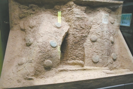三門峽兩周墓出土盾牌,藤編盾體,表面裝飾有青銅泡釘