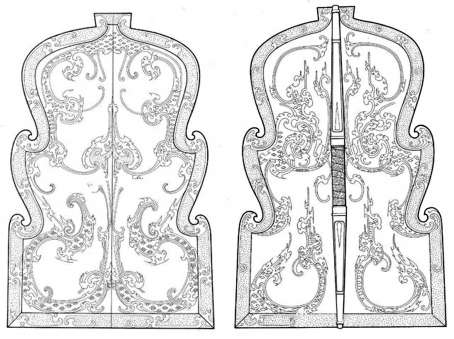 《詩經(jīng)·秦風(fēng)·小戎》詩曰:“ 騏 騮(qíliú)是 中 ,騧(gu?。P是驂(cān)。龍盾之合,鋈(wù)以觼軜(jué nà)?!边@首詩據(jù)說是兩周之際秦國婦女為征夫所作,大意是:不但拉戰(zhàn)車的馬兒成雙成對(duì),就連盾牌上畫的龍、御手手中的繩環(huán),也是成雙成對(duì)的,而我卻和您不能在一起啊!可見,與商代盾牌繪制虎紋類似,周代也有部分盾牌會(huì)繪制龍紋。