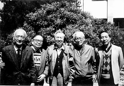 1992年,王佐良(中)與李賦寧(左一)、裘克安(左二)、周玨良(右二)、胡文仲在北外。圖片由作者提供