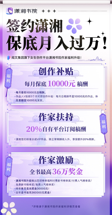 9月14日,閱文集團旗下瀟湘書院發(fā)布全新作家福利,升級推出瀟湘開站四大福利,含保底稿酬月入過萬,全年全書最高36萬元獎金激勵等。這是瀟湘書院投入一億資金扶持女性創(chuàng)作者,重磅發(fā)布“紫竹計劃”后的重要舉措。