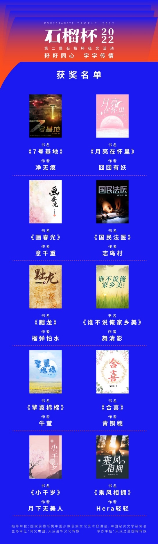 現(xiàn)場(chǎng)揭曉了第二屆石榴杯征文活動(dòng)的獲獎(jiǎng)名單。本屆石榴杯以“籽籽同心 字字傳情”為主題,經(jīng)專家顧問團(tuán)、影視平臺(tái)推薦及嚴(yán)格評(píng)審,《7號(hào)基地》《月亮在懷里》《畫春光》《國(guó)民法醫(yī)》《黜龍》《誰不說俺家鄉(xiāng)美》《擎翼棉棉》《合喜》《小千歲》《乘風(fēng)相擁》等10部網(wǎng)絡(luò)文學(xué)作品獲得“優(yōu)秀作品獎(jiǎng)”,并將被收錄入中國(guó)民族文化資源庫。
