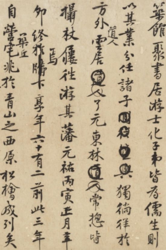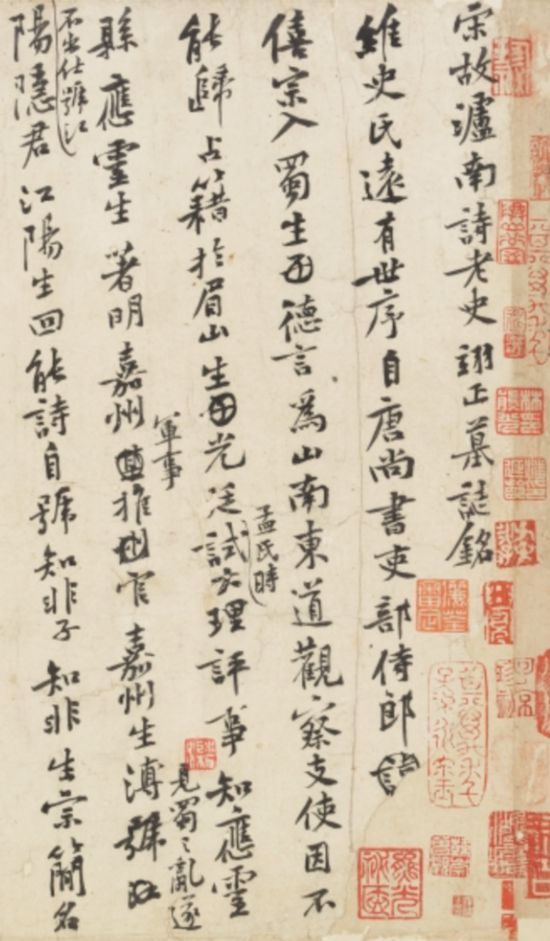 而《宋盧南詩老史翊正墓志銘稿》,凡二十一行,另補寫五行,行二十字左右。全稿文字涂改約二十處,亦非定稿本?!盀o南詩老”史扶,字翊正。史氏家族自唐僖宗年間入蜀,占籍于眉山。史氏少時篤學能詩,然屢試科舉不第,后游瀘州,閉門讀書并教授弟子,士人推與之曰“詩老”。紹圣三年(1096)四月卒于瀘州,葬于元符二年(1099)正月。時黃庭堅貶官戎州(今四川宜賓),史扶嫡次子史鎮(zhèn)遂請為撰墓志銘。此墓志銘稿無署款及年月,因其中有"葬以元符二年正月癸亥",徐邦達先生《古書畫過眼要錄》定此墓志銘為元符二年所作,時山谷五十五歲。