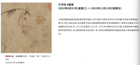 對于此次展覽,東京國立博物館在官網(wǎng)上如是介紹:“中國書畫精品展是本館秋季的例行展覽。今年正值中日邦交正?;?0周年暨東京國立博物館創(chuàng)建150 周年。值此之際,本次展覽不僅從本館收藏或保管的中國繪畫精品中,聚焦自古備受日本人喜愛的北宋(960 年-1127 年)及南宋(1127 年 -1279 年)時期作品予以介紹,還將深受宋代繪畫影響所創(chuàng)作的元、明、清時期書畫珍品匯聚一堂,供各位來賓感受宋代繪畫在畫壇上舉足輕重的地位。”