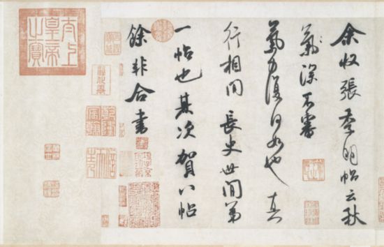 《張季明帖》:“余收張季明帖,云’秋氣深,不審氣力復何如也’,真行相間,長史世間第一帖也。其次《賀八帖》,余非合書。”