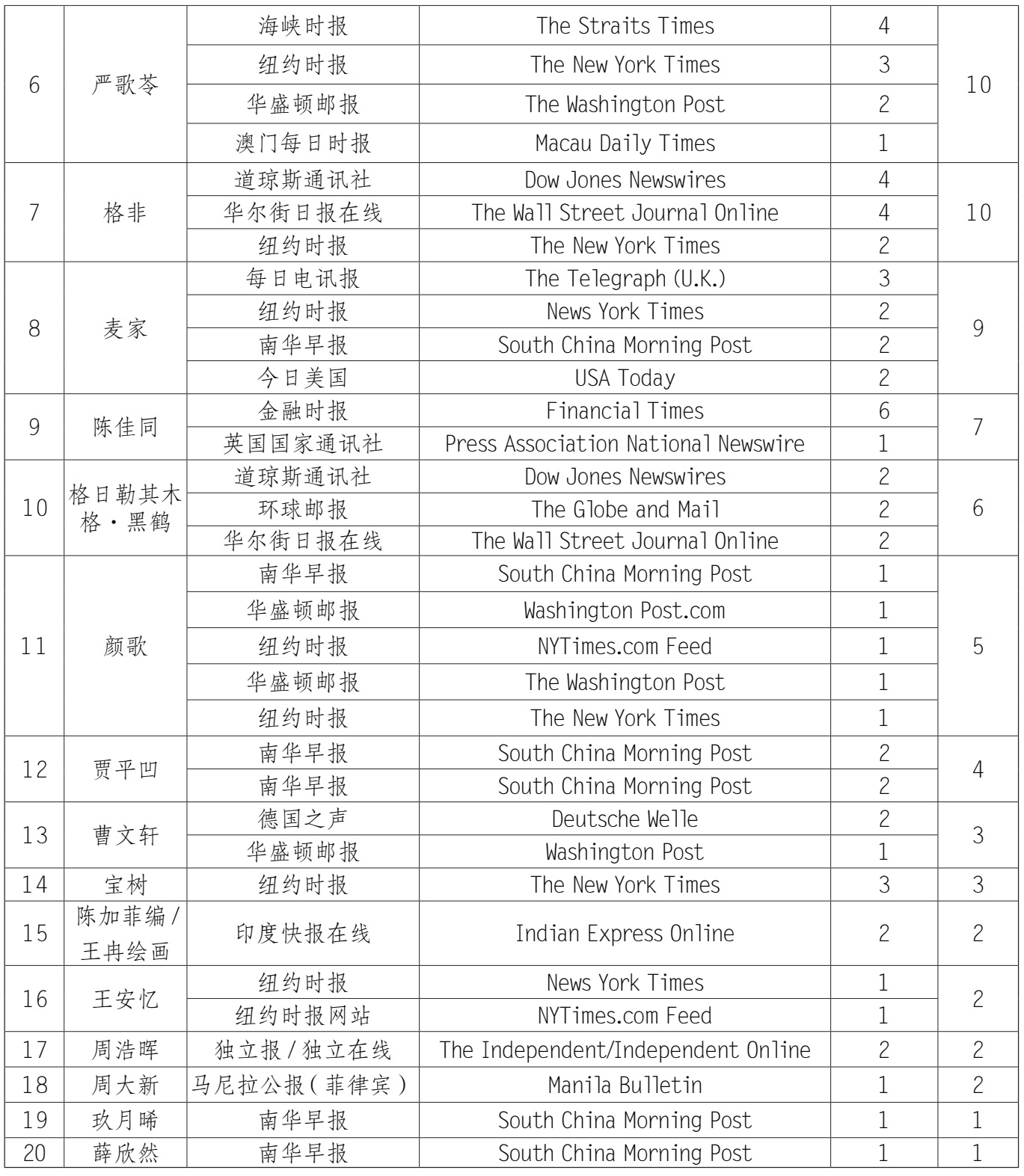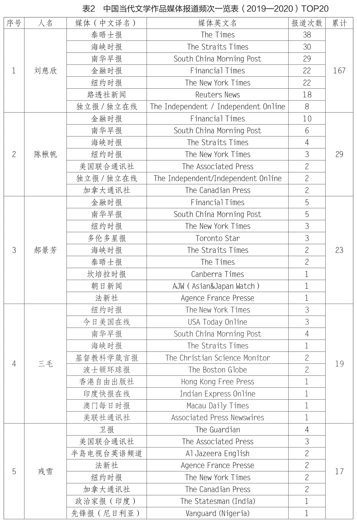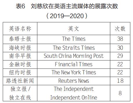 如《紐約時報》,第一次以“《三體》為美國科幻小說迷換口味”為題,在2014年11月10日刊發(fā)了正面書評,認(rèn)為“目前美國的很多頂尖科幻小說作家摒棄傳統(tǒng)的外星人入侵情節(jié),更青睞反映現(xiàn)實世界的題材,諸如氣候變化和性別轉(zhuǎn)變之類”,而《三體》是第一部講述異于地球的三體人文明與地球人互動的故事,這種不同文明之間沖突的故事會更受美國讀者的青睞。此后有關(guān)劉慈欣《三體》的書評分別出現(xiàn)在英國《衛(wèi)報》《每日電訊》《海峽時報》,美國《華爾街日報》《芝加哥論壇報》《大西洋月刊》《紐約客》《洛杉磯時報》,美國公共廣播電臺、美國康納仕集團(tuán)GQ雜志,澳大利亞《悉尼先驅(qū)晨報》《澳大利亞人報》,印度快報雜志等主流媒體,以及專業(yè)科幻類雜志,如軌跡(Locus)雜志、網(wǎng)站,專業(yè)科技類雜志有線(WIRED)雜志、網(wǎng)站,專業(yè)物理空間雜志《物理學(xué)(Phys)》、網(wǎng)站等近200多家主流大眾媒體與科學(xué)幻想類、物理學(xué)類等專業(yè)媒體。依據(jù)Factiva 數(shù)據(jù)庫在2021年8月的份檢索,得到劉慈欣在2019至2020年兩年在英語世界的主流媒體展露次數(shù),見表6。